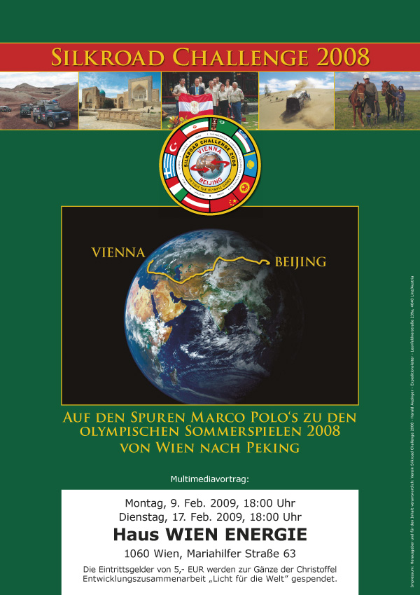 Die Reise war ein großer Erfolg! Bei Multimediaberichten für Freunde und Sponsoren erhalten Sie einen noch besseren Einblick in das große Abenteuer "Silkroad Challenge 2008". Wir werden Sie laufend über aktuelle Termine informieren.