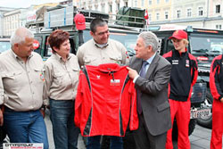 Der Landeshauptmann überreichte dem Team die Oberösterreichische Flagge, Trainingsanzüge vom Sportland Oberösterreich und jeder bekam noch eine Linzer Torte, was Dr. Pühringer folgend kommentierte: "...die kann auf der langen Reise nicht mehr austrocknen" - und hatte die Lacher natürlich auf seiner Seite.