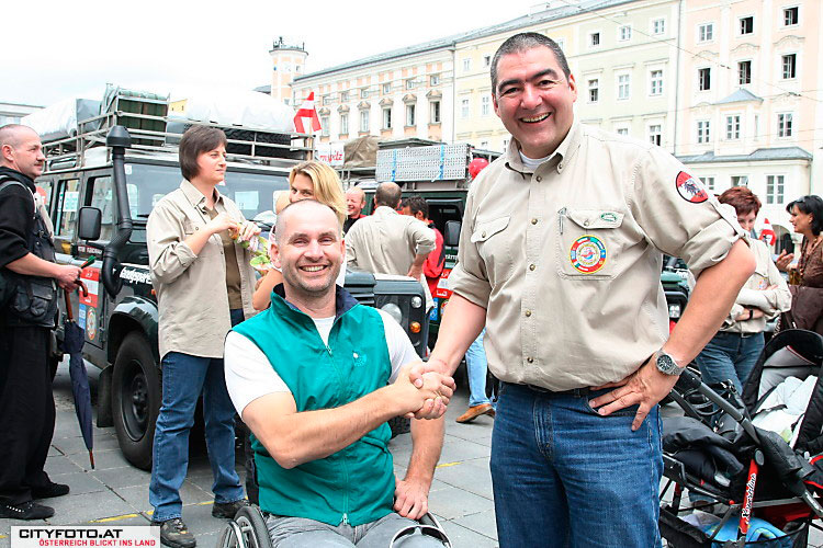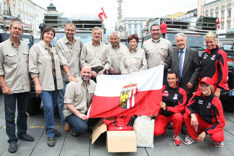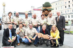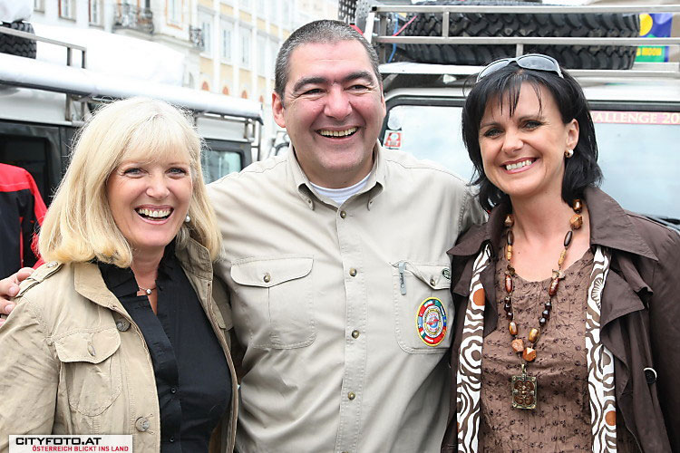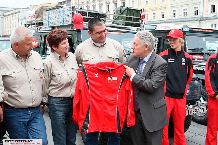 Landeshauptmann Dr. Josef Pühringer und die 3 OlympiateilnehmerInnen Sabrina Filzmoser (Judo), Jördis Steinegger (Schwimmen) und Günther Weidlinger (Laufen) bildeten neben Linzer Gemeindepolitikern und vielen Sponsoren einen würdigen Rahmen für die Verabschiedung des Silkroad Challenge 2008 Teams am Hauptplatz in Linz.