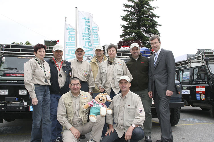 Bei einer Zwischenstation in Wolfsberg, der Heimat von Sophie und Walter Moitzi, geht es im Konvoi mit dem hiesigen Landyclub durch die Stadt. Bürgermeister Dr. Gerhard Seifried (hi. 3. v. re.) verewigt sich im Bordbuch. Bäcker Gerhard Jäger (ganz li.)stellte sich mit einer Ladung voll frischem Schlattebrot als Reiseproviant ein.