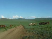 Mittwoch durchqueren wir den letzten Teil der mongolischen Gobi. Jede Menge Gazellen, Kamele und Pferde prägen die Landschaft. Wir stoßen wieder auf eine sauschlechte Piste und trösten uns mit der Gewissheit, dass es nur mehr 100km sind. Am Abend beschließen wir bei einer gemeinsamen Gulaschsuppe den letzten Tag in der Wüste Gobi.