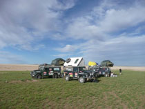 Am Montagmorgen ist es sehr kalt mit Temperaturen knapp um die 10°C. Wegen der stürmischen Nacht haben alle wenig geschlafen und der Abbau der Zelte auf den Autodächern gestaltet sich bei der hohen Windgeschwindigkeit als echte Herausforderung. Dann fahren wir wieder nur nach GPS und Kompass durch die Wüste Gobi. Auf den Felsen der Umgebung finden wir jede Menge verlassener Adlerhorste. Ein einziger ist mit einem Jungtier besetzt, zu dem wir jedoch ausreichend Abstand halten. Bei der Weiterfahrt stoßen wir wie gestern auf Glücksritter mitten in der Wüste. Diese suchen jedoch nicht nach Gold, sondern nach Edelsteinen. Sie zeigen uns auch bereitwillig ihre Schätze und wir kaufen einige Steine als Souvenir. Am Abend finden wir als Entschädigung für die Sturmnacht einen ruhigen Lagerplatz ohne Gelsen und genießen eine sternenklare Wüstennacht.
